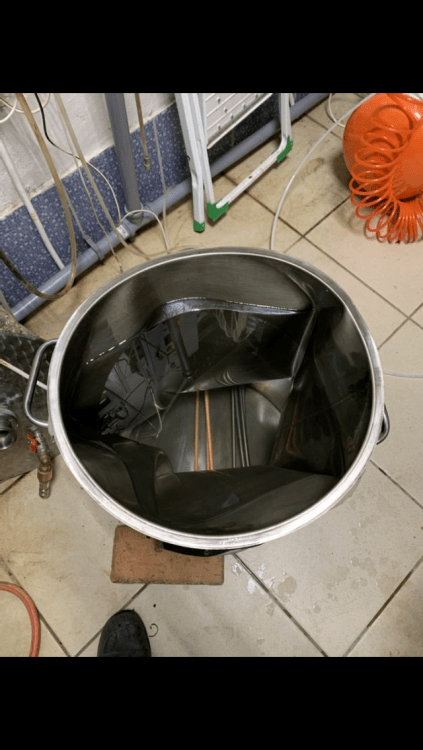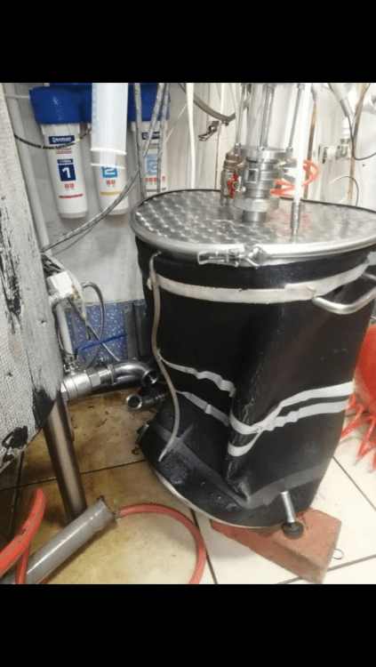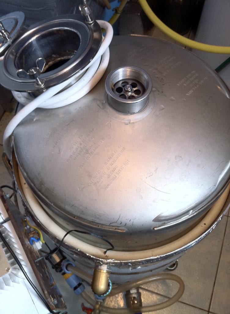 Пароводяной котел (ПВК) широко применяется в пивоварении и в винокурении при производстве зерновых дистиллятов, т.к. позволяет быстро и удобно осуществлять температурные паузы при осахаривании зерновых заторов.  Конструкционно ПВК рассчитан на работу под давлением пара в рубашке  и, как правило,  оснащается мешалкой, что позволяет минимизировать эффект взрывного закипания. Поэтому ПВК широко применяется в вакуумном винокурении. На фото (рисунок 5.2) показан экспериментальный ПВК, сделанный POLE в домашних условиях из двух кег, с вертикально установленной мешалкой, загрузочным люком и блоком управления нагревом.