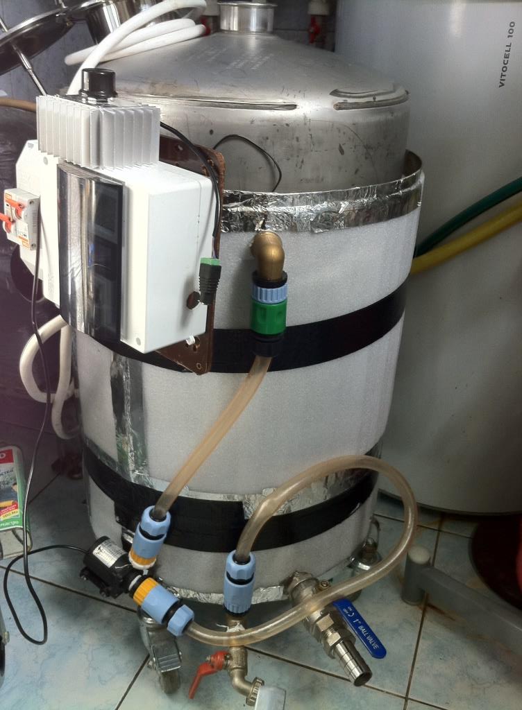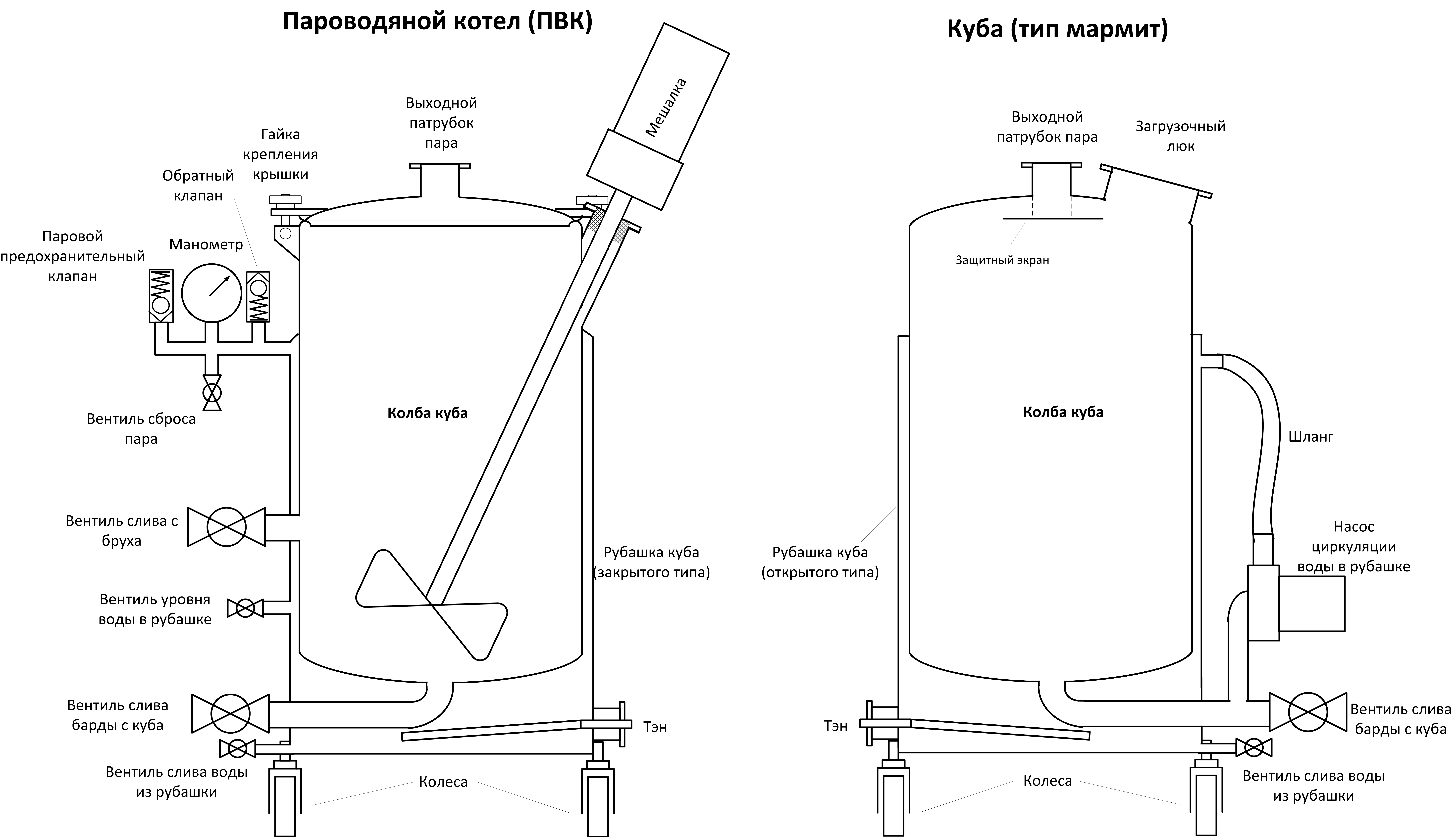Куб (тип мармит) близок по конструкции с ПВК, но с отличием, что рубашка не герметична, т.к. для ВД  нет необходимости разогревать воду (теплоноситель) выше 60С. Колба  куба на 30-50 литров, как правило, изготавливается из пивных кег. В целях устранения эффекта взрывного закипания предусмотрена принудительная циркуляция теплоносителя в рубашке (насос) (рисунок 5.4 и 5.5).