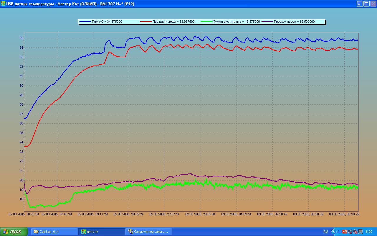 Рисунок 1.1. Кривые температур пара при вакуумном брожении с отделением паров спирта (экспериментальные данные POLE).
