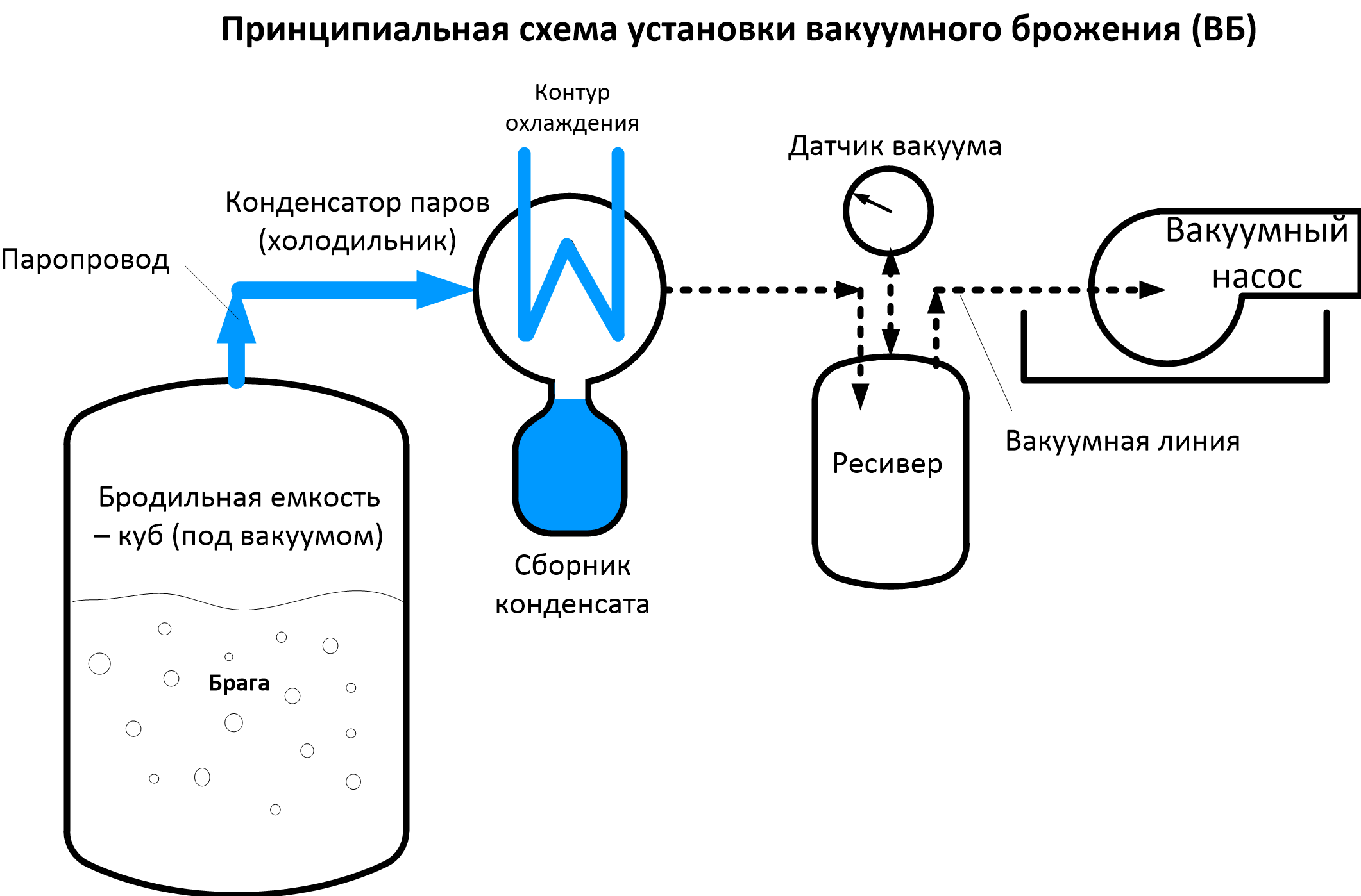 В вакууме углекислый газ выводится из бродильной емкости, поэтому дрожжам легче перерабатывать сусло. При накоплении спирта в браге более 5% процесс брожения начинает замедляться. Если из бродильной емкости удалять спиртовые пары, то скорость брожения не будет снижаться пока дрожжи не переработают сусло. При этом в браге значительно меньше образуются вторичные продукты брожения (глицерин, уксусный альдегид, уксусную, янтарную, лимонную, пировиноградную кислоты, 2,3-бутиленгликоль, ацетоин, эфиры) и побочные продукты брожения — высшие спирты (пропиловый, бутиловый, амиловый, изопропиловый, изоамиловый, изобутиловый и др.).