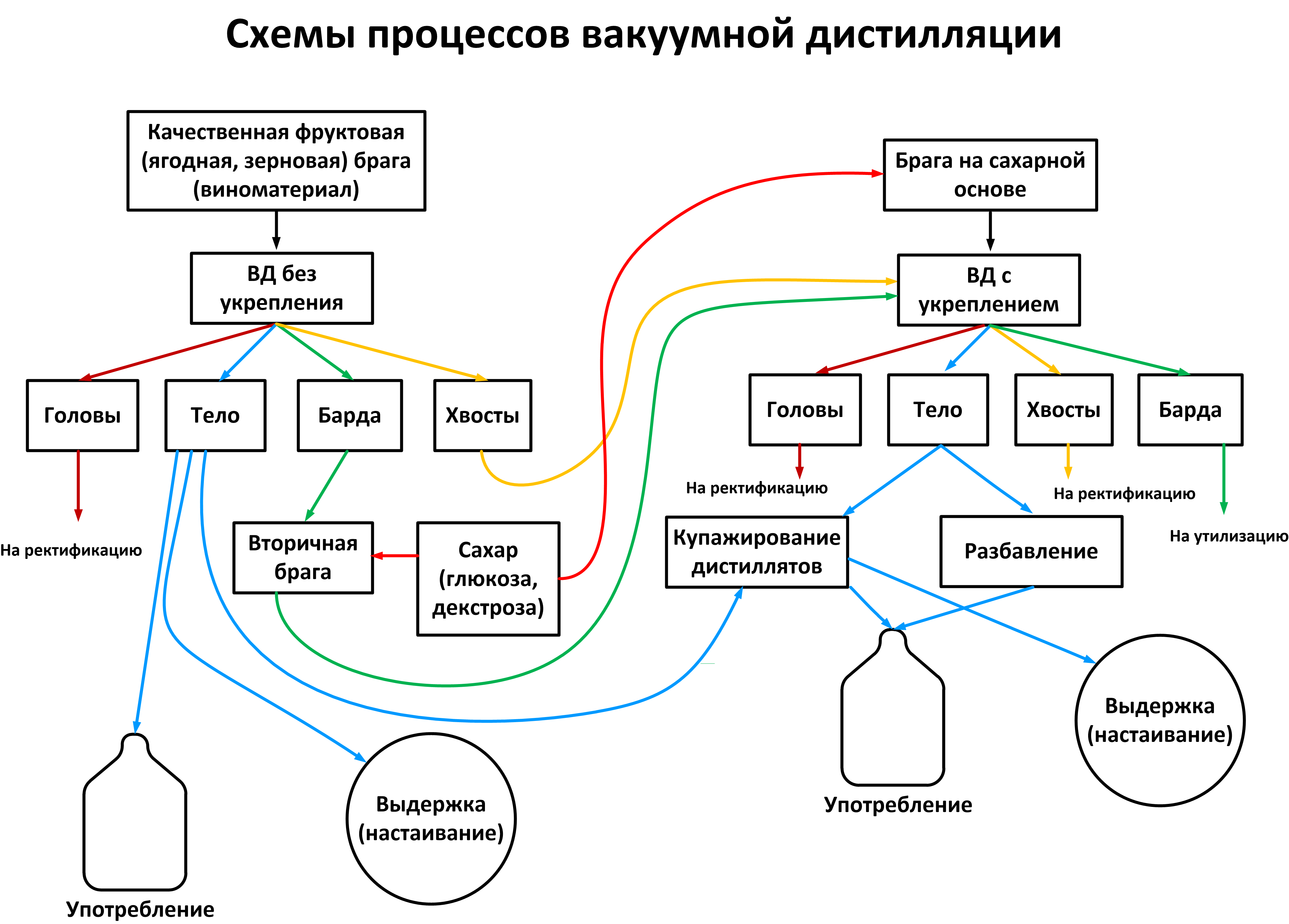 Вакуумную дистилляцию можно проводить в двумя основными способами: без укрепления и с укреплением. Без укрепления (прямая перегонка) — получение дистиллята из исходного сырья (браги) крепостью около 38-42%. С укреплением (перегонка на укрепляющих устройствах как браги так и спирта сырца) — получение дистиллята от 80% и выше вплоть до 96-98% крепости (вакуумная ректификация — ВР).
