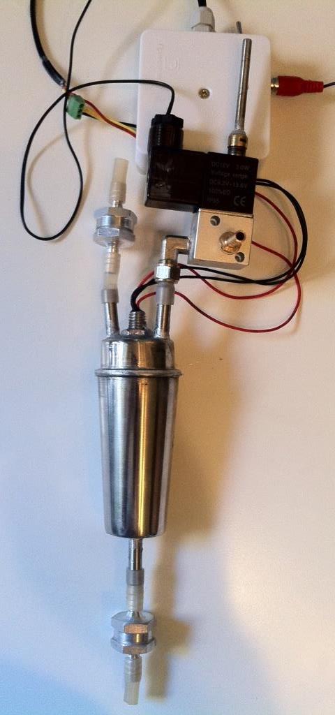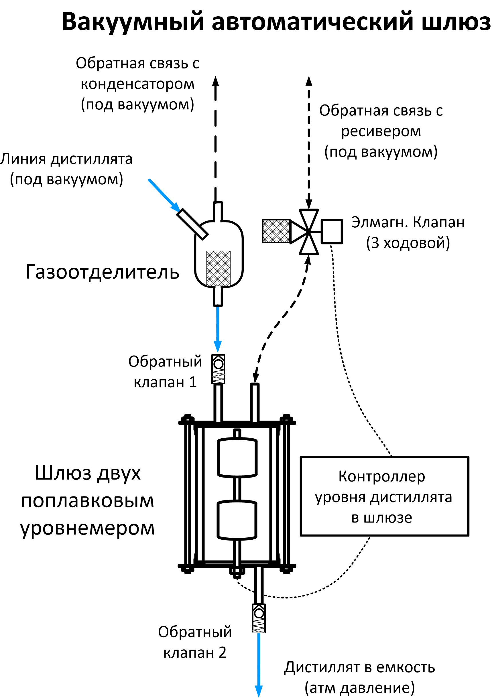 По сигналу с двух поплавкового уровнемера включается и выключается трехходовой электромагнитный клапан, напуская и откачивая воздух из шлюза. При этом в автоматическом режиме происходит заполнение и слив с шлюза дистиллята. Минимальная порция отбираемого дистиллята определяется свободным объемом шлюза. В действующих конструкциях она составляет 30-50 мл. Остаточное количество дистиллята в шлюзе также зависит от конструктивных параметров выводящей трубки и нижнего обратного клапана, и составляет около 1 мл.
