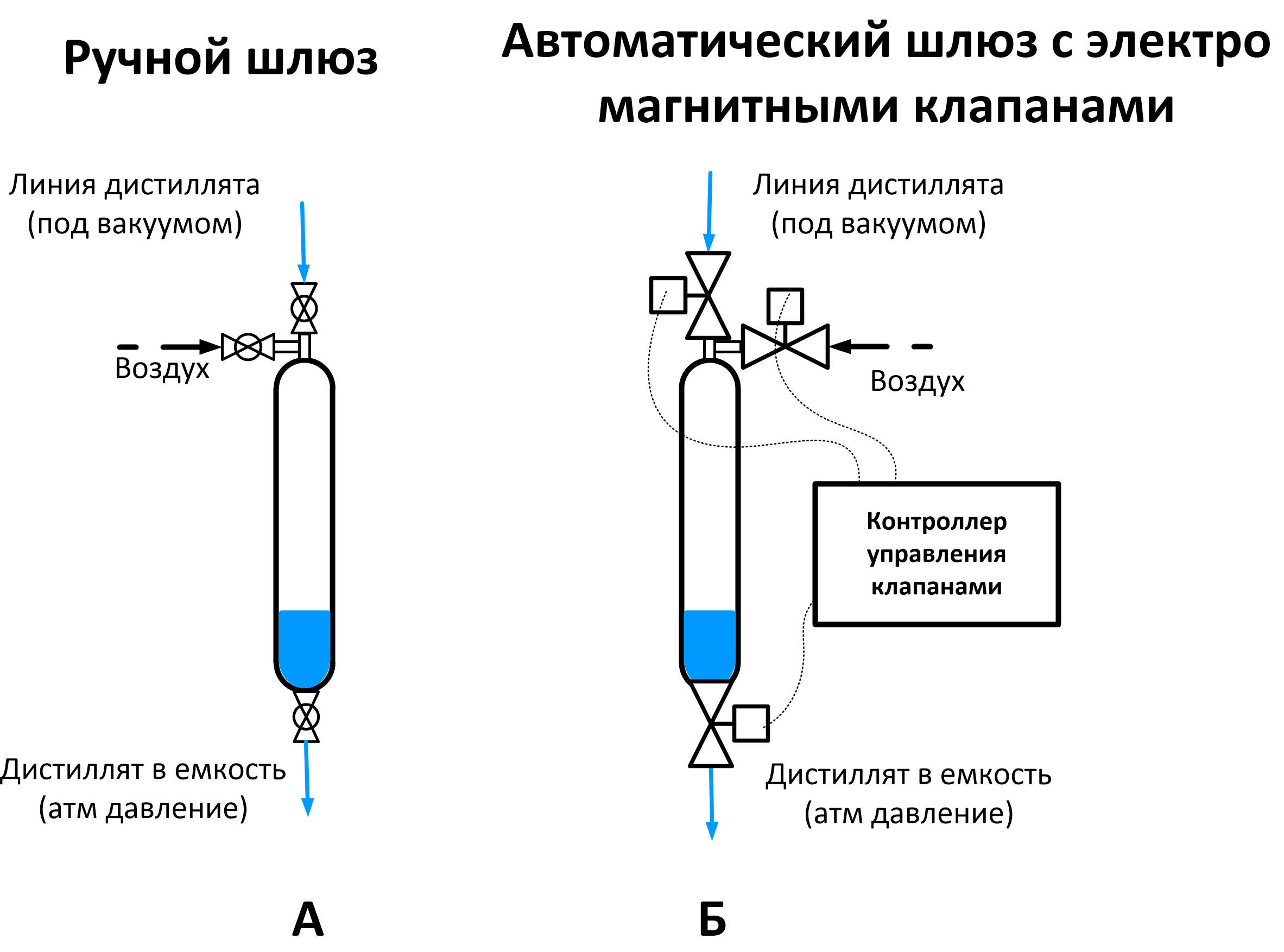 Чтобы разделять дистиллят на головы, тело и хвосты в процессе вакуумной дистилляции (ВД) используют дополнительные устройства, которые позволяют отбирать и выводить дистиллят из зоны вакуума в зону атмосферного давления без ущерба процессу ВД. В качестве устройств отбора дистиллята используют: ручной шлюз (РШ); автоматический шлюз с электромагнитными клапанами (АШ); вакуумный автоматический шлюз (ВаШ); вакуумный перистальтический насос (ВПН). В разработке находится шлюз-шприц, конструкция которого активно обсуждается в профессиональном сообществе домашних винокуров.