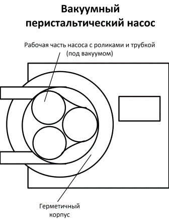 Вакуумный перистальтический насос (ВПН) разработан коллегами и представляет собой обычный перистальтический насос у которого рабочая часть с роликами и трубкой помещена в герметичный вакуумный корпус (рисунок).